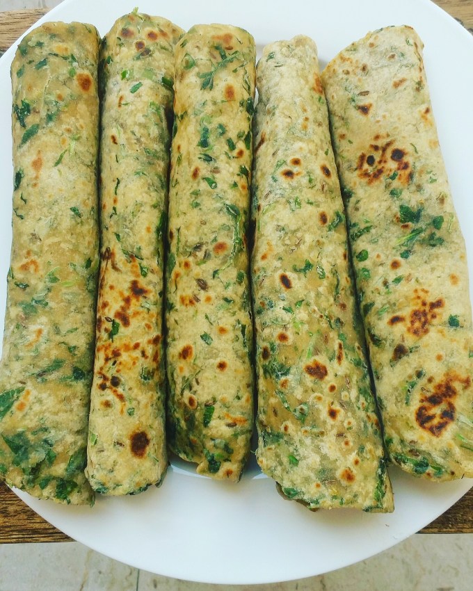 Methi leaves (fenugreek leaves) are very good for health as they are rich in antioxidant, iron and also a good source of dietary fiber. It is a very good lunch box dish for kids. Kids are very fussy to eat methi since has little bitter taste. But if you are making parathas or roti with methi the bitterness will not be there. It is very easy to make this roti. I used whole wheat flour, some spices and methi leaves to make this roti or paratha. Let us see how to make this roti.
