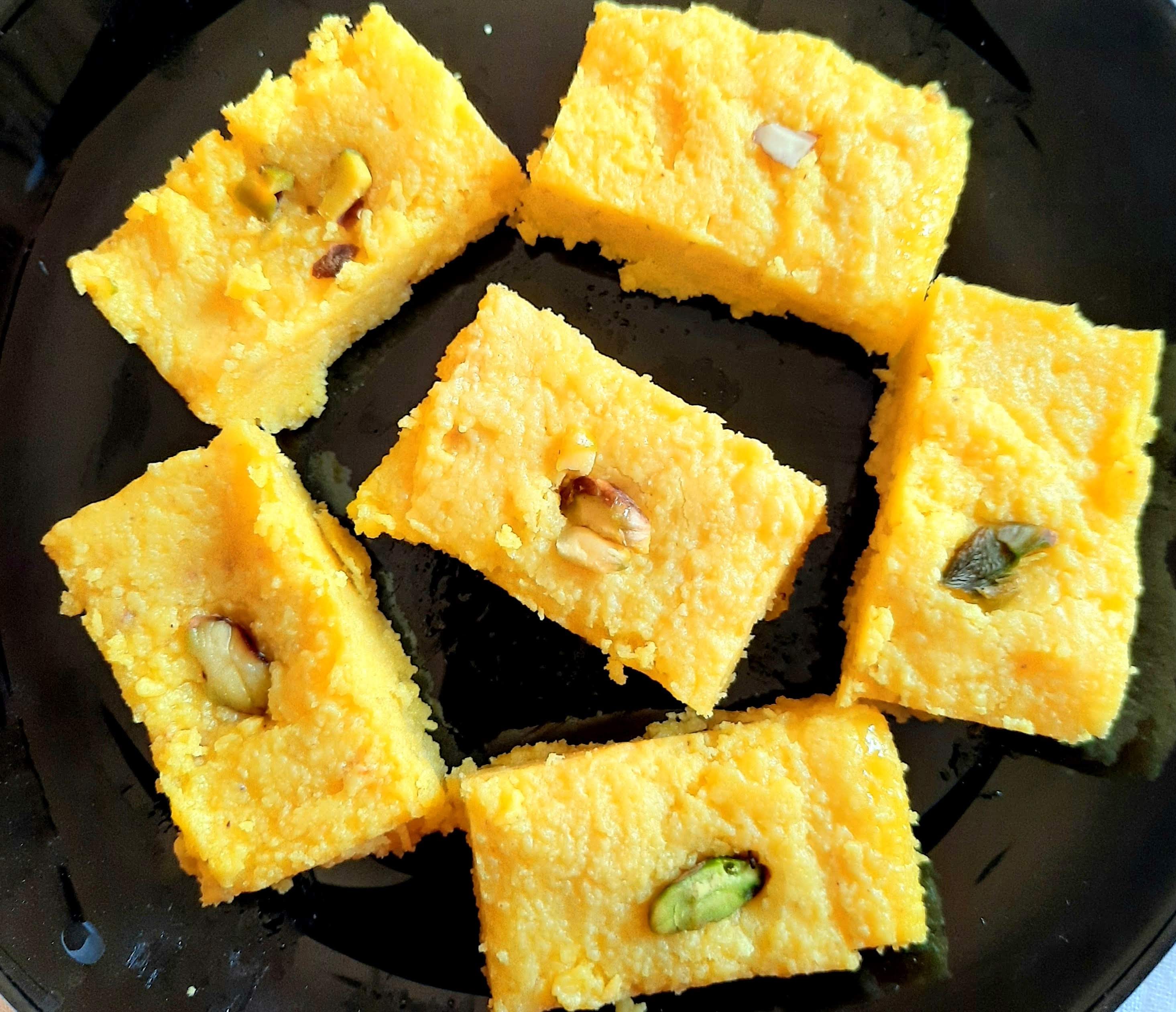 In the mean time grease a tray or glass box with ghee and keep aside