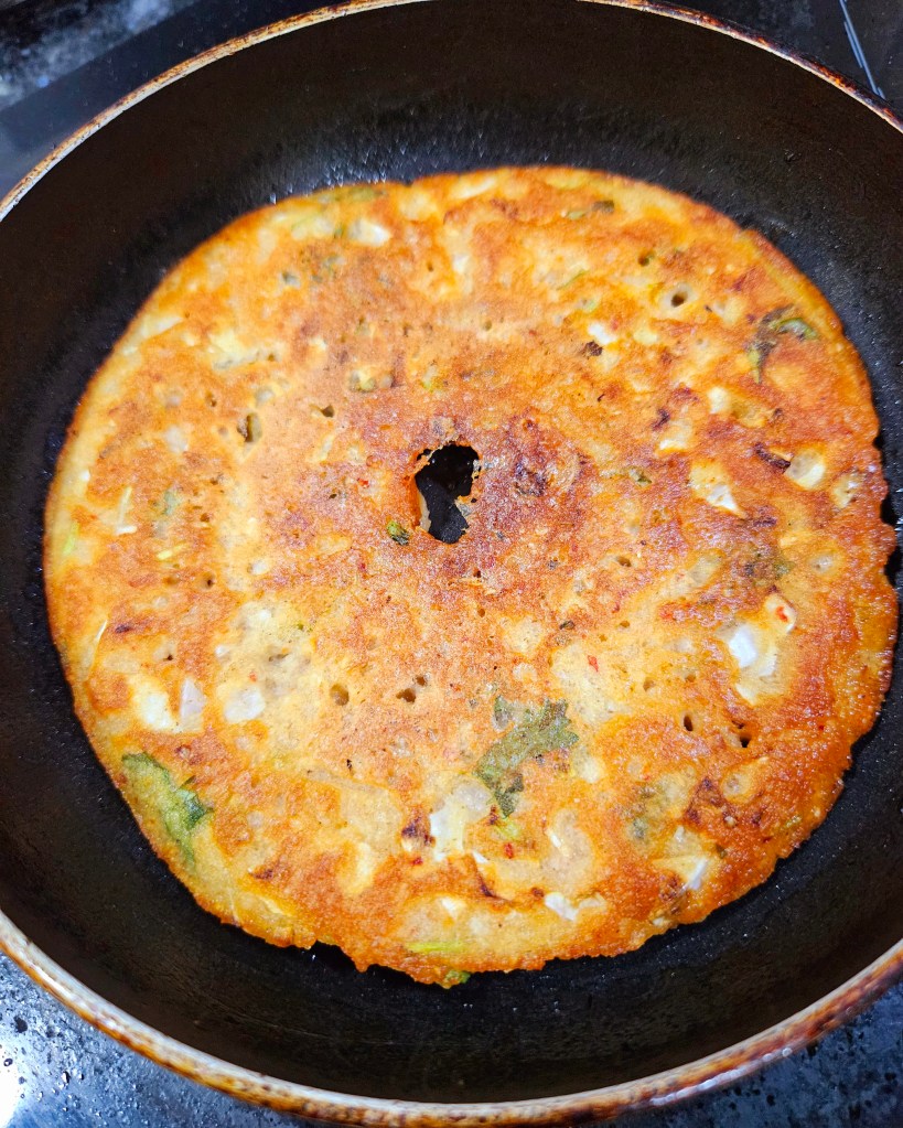 Heat a small pan. Add oil. Pour a laddle full batter. In medium heat cook. Close it with a lid. When one side is crispy flip it. Add little oil and roast it.